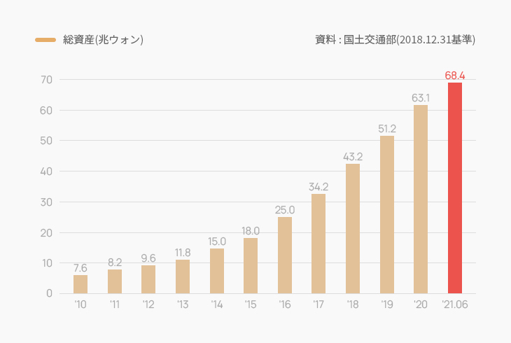 総資産の規模は着実に拡大し、2021年上半期基準の総資産は68.4兆ウォンとなっています。