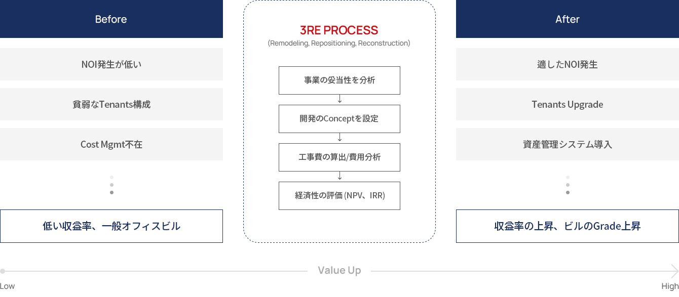 K-TOP REITsは、4大核心投資分野を対象に3RE Processを通じたValue Added投資運用戦略を行うことで、